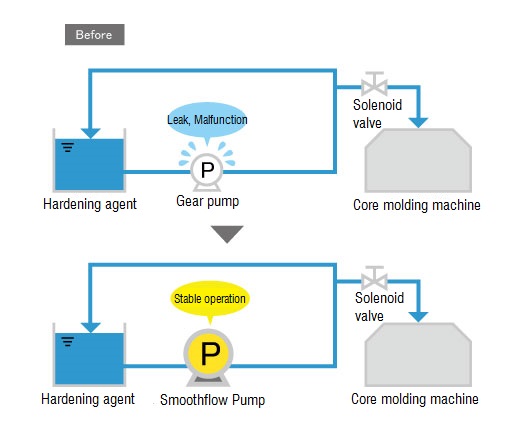 A gear pump was used to supply the curing agent, controlling the amount to inject with a solenoid valve, which posed the following problem.