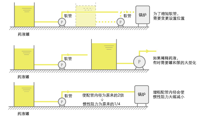 因为变更软管内径施工相对简单,效果也以2次方显现,而且也不必考虑吐出量的变化。但是,有一些缺点,因此设置计量泵时,预先考虑泵的布局、惯性阻力显得重要。