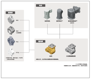 ]SUS、SUS(卫生型)、PVC、PTFE 也兼容除上面外的材质、如钛、哈氏合金C和PVDF。[电机]标准电机、通用电机*1、 防爆电机*1 (d2G4)、带控制器的电机、[驱动部]标准、Kanigen电镀 *也可提供客户指定的其它涂层规格。*1 另外需要专用适配器。*接液部为示例。根据不同机型,形状可能不同。](/tacmina/public_com/china/products/pump/smoothflow/images/xpl-img-13.png)