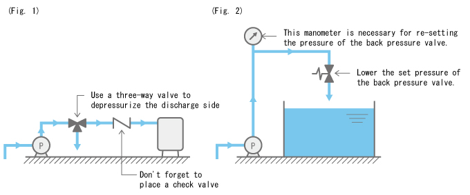 The easiest way to accomplish this is to depressurize the discharge side by opening the discharge-side valve to atmospheric pressure. If the pump is injecting liquid into a high-pressure tank, relieve the pressure using a three-way valve. (Between the three-way valve and the high-pressure tank, be sure to place a check valve in the direction necessary to stop backflow from the tank.) -- Fig. 1