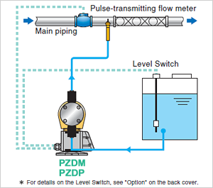 Injection amount (1/9999 to 9999 strokes/pulse) can be set based on pulse input signals from outside. Interlocked with a pulse-emitting flowmeter to enable simple performance of a variety of automatic controls.