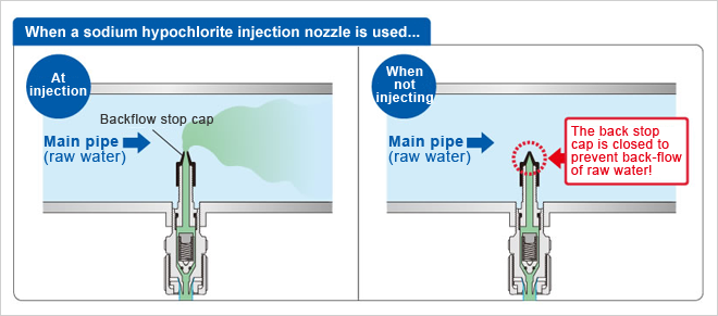 The injection nozzle was developed exclusively for sodium hypochlorite to prevent crystallization and clogging due to back-flow or reactions with raw water.
